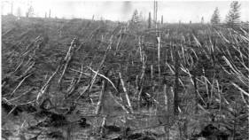Myndin í neðra varð tikin fleiri ár aftaná Tunguska-hendingina í Sibirien. Júst hvat brast yvir jørðina í 1908 er ikki staðfest, men tað er mest sannlíkt ein meteorur ella ein lítil komet.