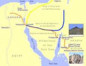 Í 2.Mósebók lesa vit um burturferðina hjá ísraelska fólkinum og tær 10 plágurnar, Gud førdi inn yvir Farao og egyptiska fólkið. Í mongu øldirnar, ið eru farnar síðan hesa skakandi hendingar hevur verið spekulerað um og kannað, hvar ísraelar fóru um havið og heilt til okkara tíð hevur vanliga hugsanin verið, at ísraelar við Mósesi á odda fóru tvørturum Reyða Havið sunnanfyri Gosen, har ísraelar høvdu búleikast um 4 øldir og seinni mongu árini sum trælir hjá egyptum.Í Bíbliuni verður ikki nevnt, hvørja leið ísraelar fóru fyri at koma sær úr Egyptalandi. Í Mós.13,17 stendur: "Táið nú Farao læt fólkið fara, leiddi Gud tey ikki vegin til Filistaraland - sum hevði verið stytsta leiðin; tí Gud segði: "Fólkið kundi komið at angrað tað, táið tey síggja, at kríggj verður, og vent aftur til Egyptalands!" Nei, Gud læt fólkið fara umveg gjøgnum oyðimørkina móti Reyðahavi..."Vit skulu nú hyggja nærri eftir, hvørja farleið ísraelar tóku fyri at fara út úr Egyptalandi. Sambært vestligari siðvenju fóru tey suðureftir, tí hetta varð hildið vera mest sannlíkt fyri at koma til Reyða Havið. Men tað er nógv, ið bendir á, at tey ikki hildu suðureftir.Vert er at hava í geyma, at vanliga staðið at fara tvørturum Reyða Havið liggur uml. 200 km í sunnan og har er botnurin alt ov djúpur og furutur til at koyra eftir við vognum og djórum og heldur ikki eru fjøll har umleiðir, sum Bíblian nevnir, tá egyptar eltu ísraelar. Altso má rætta staðið hava verið onkra aðrastaðni.Ein onnur orsøk, at Gud ikki leiddi ísraelar hesar umleið 200 km. suðureftir fyri at fara um Reyða Havið er, at í so fall høvdu tey als ikki komið út úr landinum, Egyptalandi, so sum Gud hevði lovað teimum, tí Sinai var, og er enn á okkara døgum undir egyptiskum ræði.Og ein triðja orsøk er, at tá á døgum róku egyptar umfatandi minuvirksemi umframt, at egyptar høvdu stórar herstøðir á Sinai-hálvoynni,3 altso í tí økinum, har ísraelar í vanligari hugsan hildu ímóti og har tey skuldu vera næstu 40 árini. Tað merkir tessvegna, at tey skuldi til í einum øki, sum var undir egyptiskum ræði, og sum tískil óivað hevði merkt stríð og samanbrestir. Hettasum er rættiliga óhugsandi, tí so var hetta óivað eisini nevnt í Bíbliuni. Tvørturímóti koma tey ofta í stríð við onnur fólkasløg, sum als ikki livdu í Egyptalandi.Tað er heldur einki í Bíbliuni, ið so mikið sum rør fram undir, at ísraelar hildu suðureftir, men heldur, at Gud leiddi teir eystureftir, sum ein kann úrleiða frá 2.Mós 13. Tí tá tað hevur verður sagt, at ikki loyvdi fólkinum at snara av vegnum móti filistaland, so kann tað næstan bara merkja, at teir fyrst hava hildið beint eystureftir, sum er vegurin móti filistalandi í norði og Kanaans landi. Men hetta varð steðgað, tá Gud lat fólkið fara ein umveg til oyðimørkina við kós móti Reyða Havinum. Einasta alternativa leiðin út úr Egyptalandi var karavanuvegurin móti eystri(markerað við gulum á kortinum), sum seinni greinar seg, so hann endar í Eilat í núverandi Ísrael og hin vegurin leiðir móti Sinaihálvoynni í landsynningi. Hesar leiðir eru til enn tann dag í dag og kunnu síggjast á fylgisveinamyndum.Tað kann vera trupult hjá mongum at ímynda sær, at ísraelar hildu áðurnevndu leið til Reyða Havið, hinumegin Sinai-hálvoynni, tí hetta merkir jú, at tey ikki, eins og vanliga verður hildið, gingu runt í hesum øki í 40 ár. Tað eru kortini so nógvar orsøkir at halda, at tað fólk vanliga hevur hildið verið rætta svarið er skeivt. Vit hava longu nú sæð fleiri grundir og fleiri fara at koma afturat.Sum nevnt í erva fylgdu ísraelittar ta leið, sum er markerað fyrst í lilla liti og aftaná teir uml. 125km í landsynning, ið markerað í appelsingulum liti. Og nú byrjar tað at verða sera áhugavert, tí hesin síðsti teinurin av leiðini, sum leiðir beinleiðis móti eystri er umgyrt av tøttum fjallamassum, og tú skuldi ikki trúð, at tað ber til at finna eina gongda leið gjøgnum hesi fjøll. Men tað ber til, tí júst her liggur nevniliga ein sera javnur og slættaður dalur millum fjøllini - sostatt ein sera lættgongdur vegur fyri ta um 2 millión ella meir stóru mannamúgvuna, sum helt ávegis móti Reyða Havinum. Í tí fylgjandi fara vit at síggja, at hetta er í tráð við tað, sum stendur skrivað í Bíbliuna, eitt nú nevndu fjøllini.Tí tað er júst hjáveran av hesum fjøllum, ið er ein av mest týðandi ábendingunum fyri, at hetta staðið er tað rætta sum legupláss, ísraelar komu til, júst áðrenn Gud leiddi teir yvir Reyða Havið.Latið okkum lesa, hvat Skriftin sigur um staðið í 2. Mós. 14,1-3:"HARRIN talaði nú við Móses og segði: "Sig við Ísraelsmenn, at teir skulu venda við og gera steðg framman fyri Pi-Hakirot, millum Migdol og havið, beint yvir av Ba’al-Zefon; har skulu tit gera steðg, við havið. Farao fer tá at halda um Ísraelsmenn, at teir eru vilstir í landinum og innistongdir í oyðimørkini."Vit hyggja nú nærri at teimum nøvnum, ið eru nevnd í tekstinum, fyri um møguligt at staðfesta økið. Tað fyrsta Pi-Hakirot, er navnið á einum fjalli - ella møguliga fleiri fjøllum - í økjum. Gud nágreinar staðið nærri við at siga, at tað er framman fyri Pi-Hakirot, millum Migdol og havið. Tað er ein ávís óvissa um, hvar ella hvat Migdol sipar til, men teir flestu granskarar eru samdir um, at svarið liggur í etymologiska týdninginum á navninum. Á hebraiskum og fleiri øðrum semitiskum tungumálum kann Migdol umsetast til at merkja:1: "Eitt torn av fjøllum", ið samsvarar við "fjallatindar nær hvør øðrum" í einum ávísum øki,2: ella "ein høgt staðsett virki ella vaktartorn" (4)Í tráð við hetta greiðir egyptiska søgan frá, at nevnda fjallaøkið í eystara parti av Sinai var e